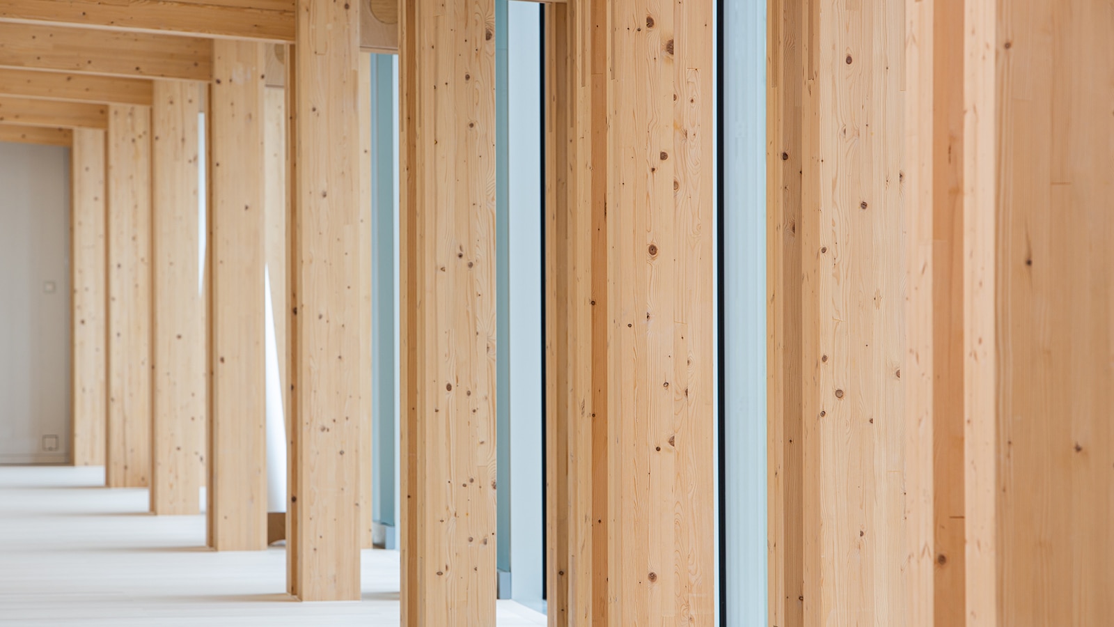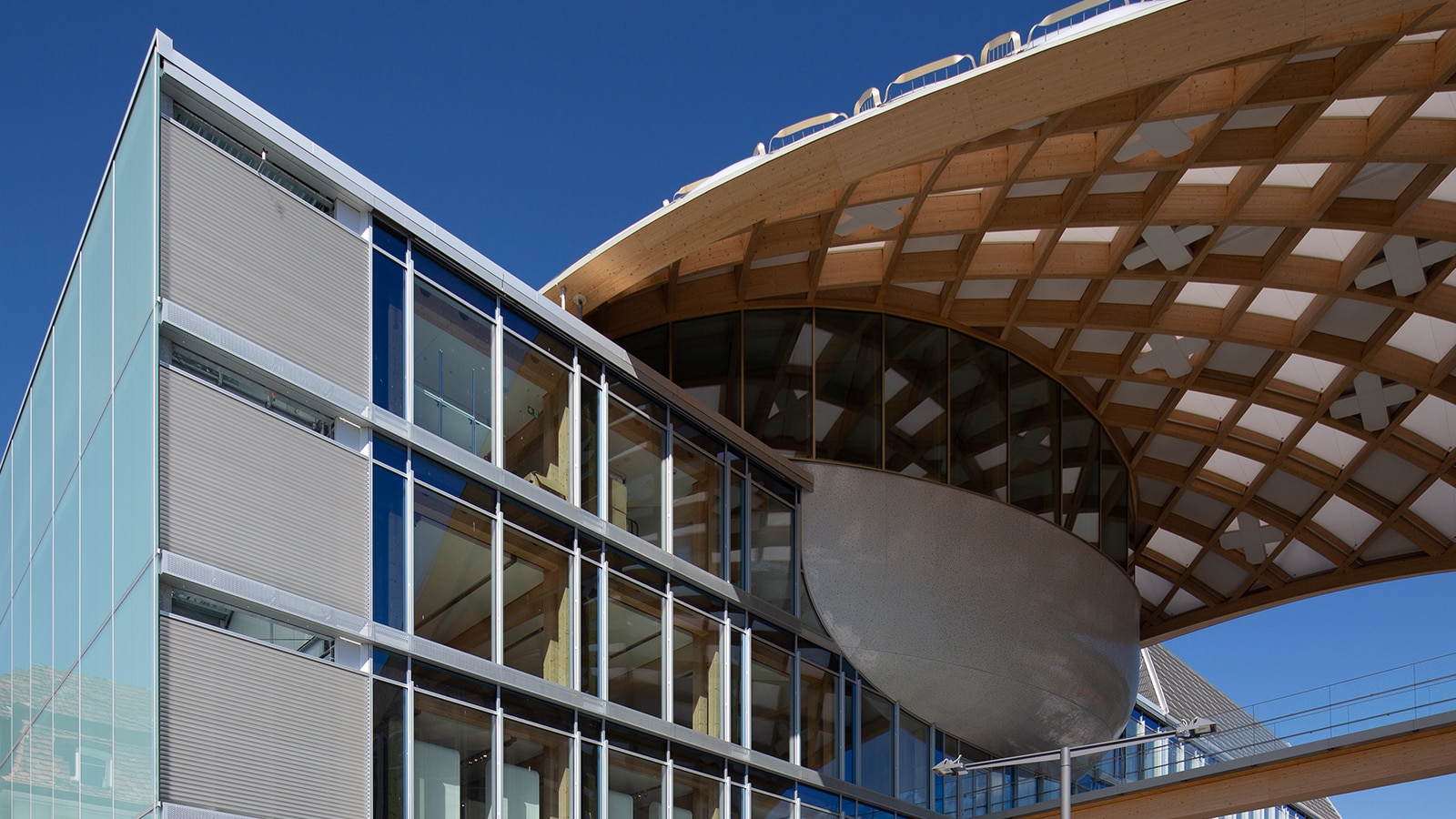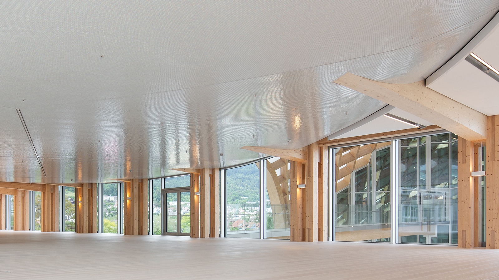 «Ein arkadenartiger, kontinuierlicher offener Raum im Erdgeschoss formt eine physische Verbindung zwischen den beiden Campus. Von diesem Bereich aus werden die Museumsräumlichkeiten in den oberen Etagen erschlossen, welche mit der weltweit fortschrittlichsten Holzbautechnologie gefertigt wurden.»