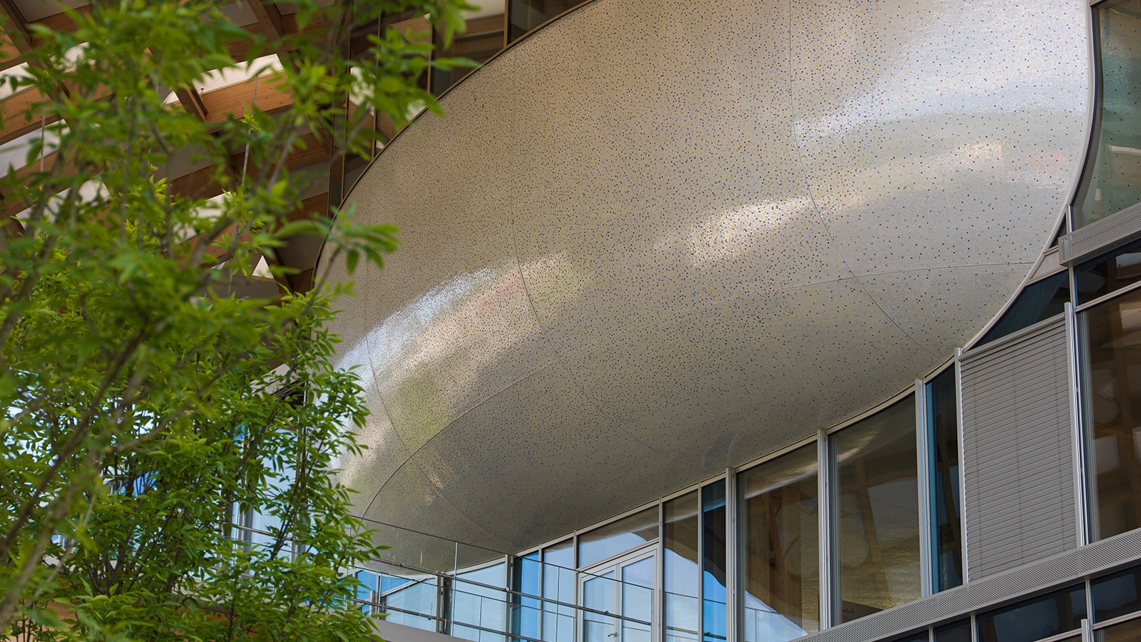Während gerade Linien und rechte Winkel die Etagen über den elegant geschwungenen Arkaden im Erdgeschoss charakterisieren, sticht die Nicolas G. Hayek Conference Hall im vierten Stock mit ihrer elliptischen Form und der kunstvollen Mosaikfassade buchstäblich heraus.